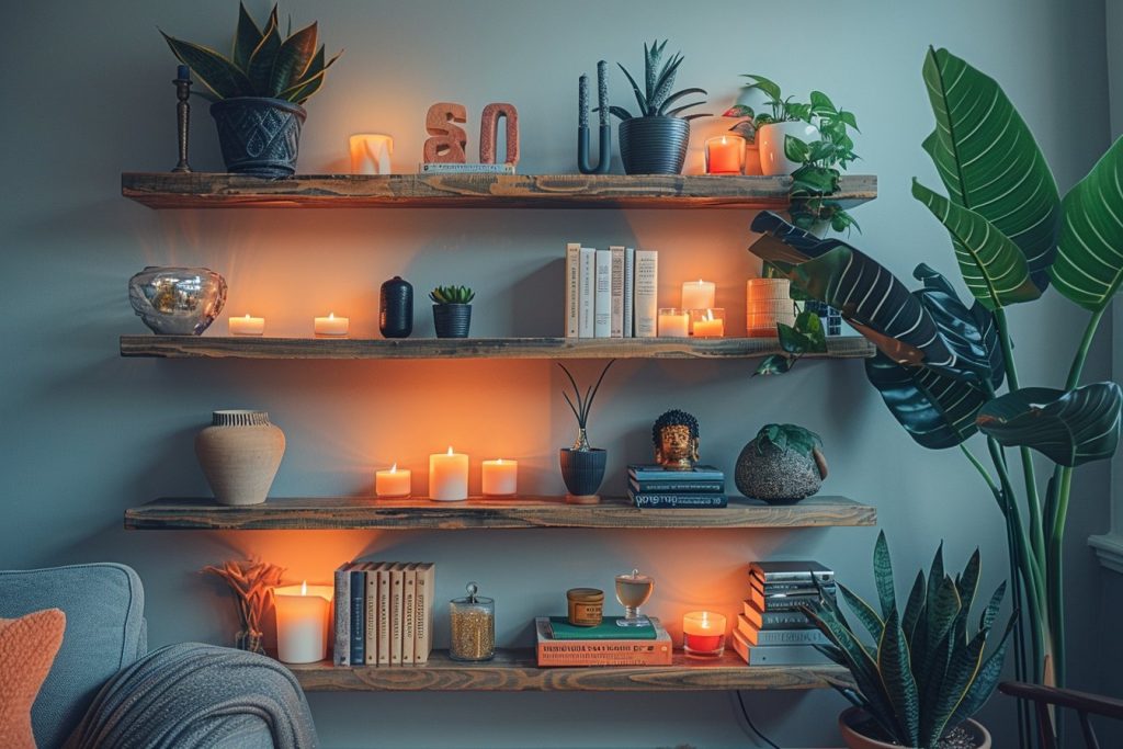 - Jouer sur les fonds et les effets : placez vos étagères devant un panneau mural avec une couleur contrastante ou un motif marquant pour mettre en valeur vos objets.